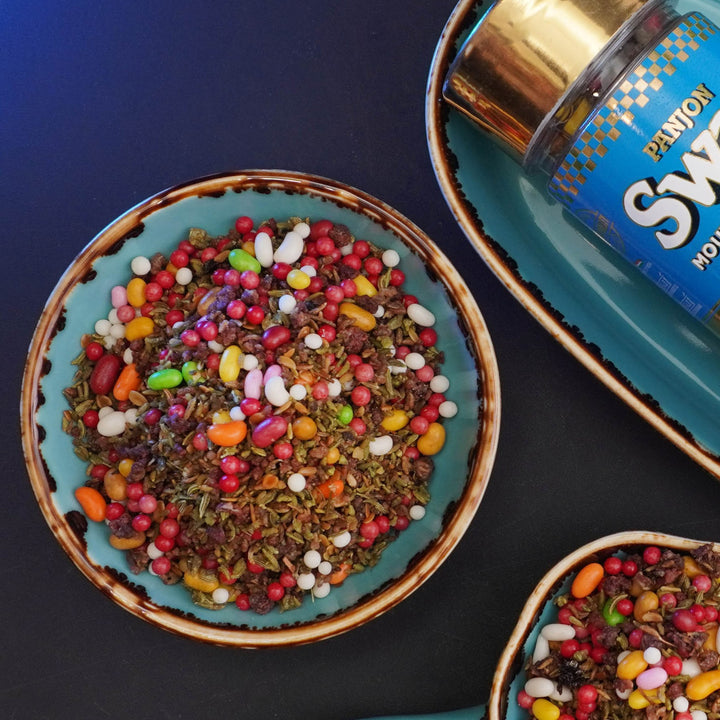 Swad Mumbaiya Mix presents a collection of 100% natural mouth fresheners infused with hand-picked fruits and ingredients, renowned for aiding digestion and promoting stomach health, enjoyed by individuals of all ages for its signature taste. Crafted with premium quality ingredients, Swad Bambaiya Daal Mix ensures hygienic packaging in reusable airtight bottles to preserve freshness and flavor. Prepared meticulously under stringent conditions, it offers a royal taste experience without compromising on quality. Swad Mukhwas aids in alleviating acidity, gas, and indigestion, free from preservatives or artificial colors, crafted solely from pure fruits, herbs, and natural elements, providing a refreshing fusion of sweet and minty flavors in every bite. Rich in antioxidants and vitamins, Swad Mukhwas invigorates the digestive system, serving as a refreshing and delicious treat for everyone.